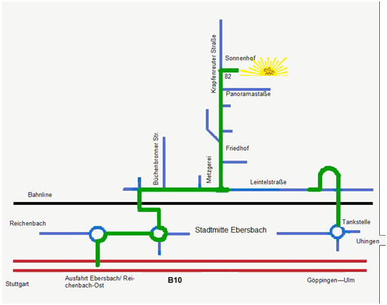 Unsere Anlage ist schnell von Stuttgart aus über die B10 zu erreichen. Fahrzeit Stuttgart-Zentrum Ebersbach ca. 35 min. Aus größerer Entfernung bietet sich die Anreise über die A8 an. Hier die Ausfahrt Wendlingen und über den Zubringer B313 zur B10. Dann weiter Richtung Ulm und Ausfahrt Ebersbach-West |